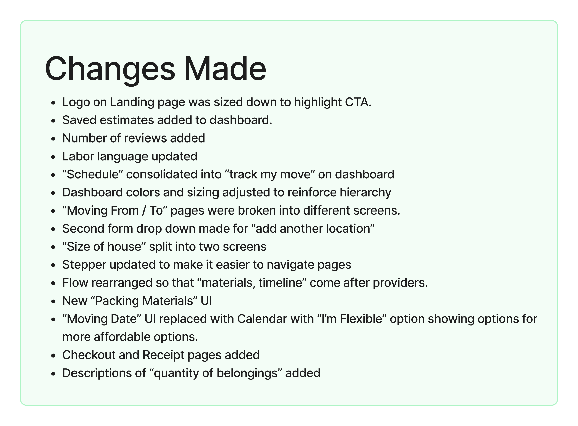 The backbone of the app is to get a quote. If users are able to easily get a quote and control variables, they’re much more likely to stick with the app all the way through planning a move and ultimately making a purchase.